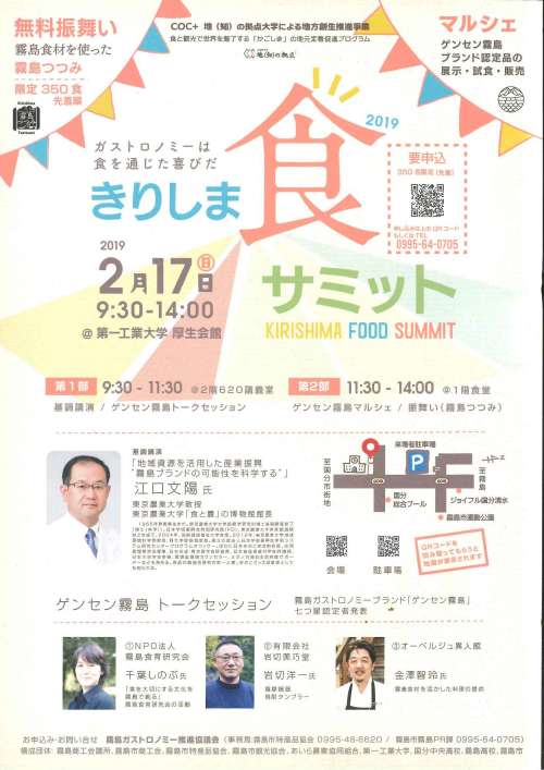 霧島ガストロノミー推進協議會により霧島の食文化を國內外に発信するために「2019年 きりしま食サミット」を開催します。第一部は9:30分から11:30分、第二部は11:30分~14:00で行われます。霧島高千穂リゾートランド、ロイヤルシテイ霧島妙見臺にお越しの際には會場へ立寄られて見ては如何でしょうか。 ○會場:第一工業大學 厚生會館 鹿児島県霧島市國分中央1丁目10-2