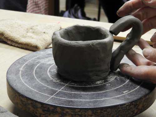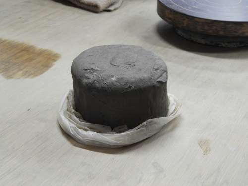 今回は、粘土をこねて形づくる「手びねり」班と「ろくろ」を使用する班の二手に分かれて、「陶蕓」に取り組みます。 私は、全くの初心者ですから、「ろくろ」などとんでもない、「手びねり」を選びました。 一人ひとりの目の前に、大きな粘土が配られました。 さあ、作業開始です。