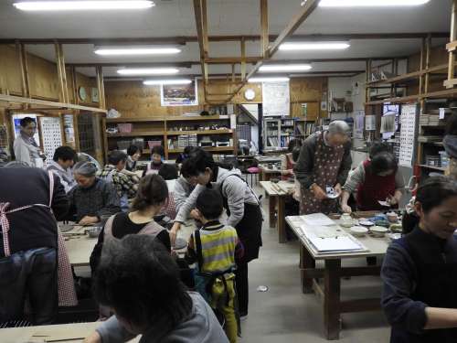 この日私達は、ダイワハウスの陶蕓教室參加者だけではなく、一般の方と一緒に作業を進めました。 窯元の職人さん方は、丁寧な全體指導のあと、さらに、マメに作業臺を回りながら、個別に細かい指導をしてくださりました。 和気あいあいとした雰囲気のなか、蕓術作品(?)が作られていきます。