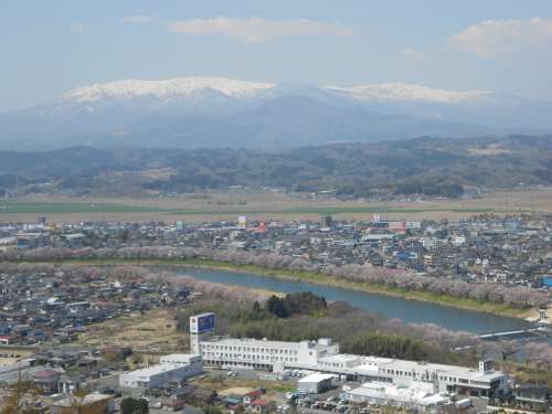 さてここからは、桜と蔵王のコラボと行きましょう。 こちらは、以前に彼岸花の話題でご紹介した、柴田町にある「船岡城址公園」からの眺めです。 遠くに連なる蔵王は、いつもより高い山にみえます。 中央を流れる川は、大河原町の「一目千本桜」から続く白石川で、両岸に植えられた桜の下を、のんびりとそぞろ歩くことができます。白石川と平行して走る東北本線では、桜の時期には、乗客が車窓から桜を楽しめるようスピードダウンしてくれます。 この日は、桜並木のピンク色があまり目立って見えなかったのが、ちょっと殘念でした。 そぞろ歩く堤防の途中には寫真の絶景スポットがあり、そこから撮った絶景寫真が、このロイヤルシティ宮城蔵王のトップページにも使用されているんですよ。 チェックしてみてくださいね。