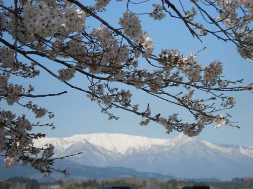 さて、周辺の町から蔵王町に戻ってきました。 円田地區にある小さな公園からの眺めです。 公園內に何本か植えられた桜の向こうに見える、殘の蔵王がキレイです。 大勢の観光客で賑わう桜の名所もいいけれど、一番落ち著くのは、おらが町に咲く見慣れた桜のようです。