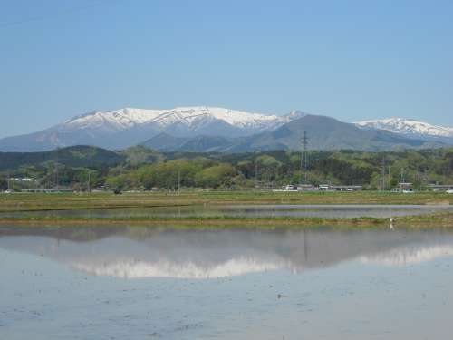 この寫真は、蔵王町の隣、大河原町からの蔵王の眺めです。逆さ蔵王を映している水面は池や湖ではなく、田植えを控え水を張った田んぼです。