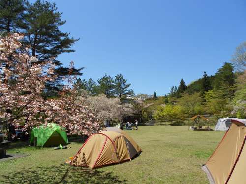 遅咲きの桜の下、10組ほどの家族連れがキャンプを楽しんでいました。