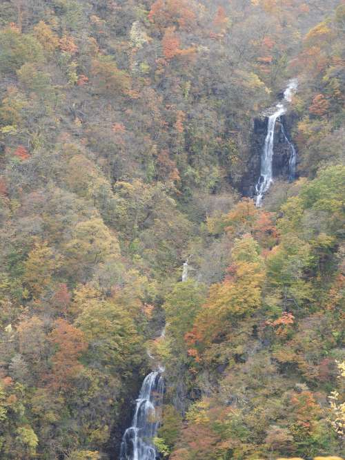 おなじみの滝見臺からの眺めです。 エコーラインを登り始めて(もちろん車で)気づいたのですが、紅葉って、もう終わりなんじゃない?ということです。なんだか、あまり美しさを感じられないのです。鮮やかさを感じない、枯れ色に向かっているような、失禮な言い方をすれば、終わったような赤色?黃色。 ただ、この滝見臺からの眺めは、三階の滝とのバランスもよく、とても美しいなと思いました。この日は平日でしたが、思いのほか多くの観光客のみなさんが訪れていたのが、嬉しくもありオドロキでもありました。
