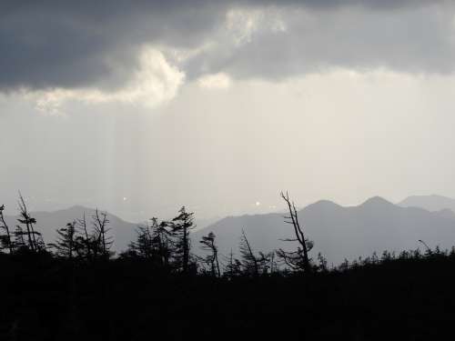 お釜に向けてどんどん登るにつれて、雲がかかり風が強くなってきました。この天気では、どう考えても、お釜を見るのは無理そうです。エコーラインからお釜に向かうハイラインには向かわずに、絶対花は咲いてないだろう、とは思いましたが、いつものお花畑へ行ってみました。 行ってみたら、まあ、お花をさがすどころの騒ぎではありません! 冷たい風が吹き荒れて、立っていられないほどです。回れ右をして車に戻ろうとしたとき、遠くの町並みが光っているのに気づきました。蔵王は雲に覆われていますが、山形県のどこかの町には、おひさまがあたっているのですね。 キラキラと反射しているのは、高いビルのガラスでしょうか。
