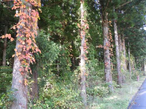 冷たい風に追い立てられるように麓におりてきた私は、例によって、いつもの散策コースを歩いてみました。 すると、前回の「秋の歌」でご紹介したツタが、そこそこキレイに色づいているではありませんか。數日でこんなに変わるものなのですねえ。紅葉のベストタイミングをきっちり把握するのは本當に難しい、とつくづく思いました。
