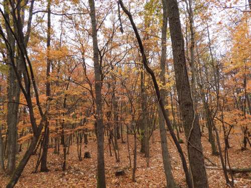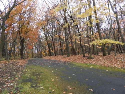 林の中の木々は葉を落とし、冬の寒々しい景色が広がっているはずですが、ご覧の通り、意外と明るい雰囲気です。葉っぱたちは、枯れた茶色にならないように踏ん張ってオレンジ色をキープし、美しいままに葉を散らせているようです。この時期にしては十分に美しい林の中を歩く私の頭の中では、「冬の散歩道」の曲がエンドレスで流れます。