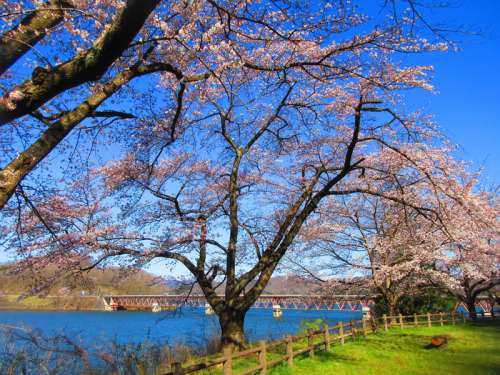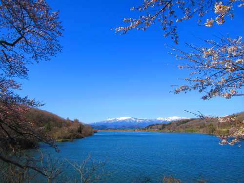 ■釜房湖と桜、殘雪のある蔵王連峰の風景は大変美しく、 寫真スポットになっています