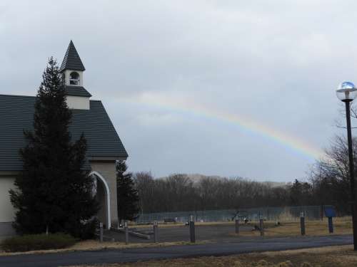毎度おなじみ「ActiveRezorts宮城蔵王」のチャペルです。 ある時、何気なく通ったところ、あら、虹が出ているではありませんか。いつでもどこでもデジカメ必攜ですから、すぐにパチリ。絶妙のタイミングでしたね。なにせ虹は、瞬きする間にもサーっと消えてしまいますから。