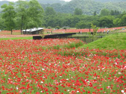 介している釜房湖のほとりにある「國営みちのく杜の湖畔公園」です。自粛期間中は、人影もなく、シーンとしてましたが、現在、公園內を覆い盡くすようにポピーが花盛りなこともあり、週末にはたくさんの観光客で賑わっていました。梅雨を前にした、短い煌めきの季節をたくさんの方が楽しんでいます。政府からの自粛要請を守り、我慢の時を過ごした人々へのごほうびです。通常は入園料を支払って公園內を散策しますが、公園脇を走る県道から、咲き誇るポピー畑の一部を垣間見ることができるんですよ。花盛りのポピー畑の中を散策する、観光客の姿が見えますね。