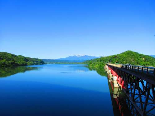 ■近くの「釜房湖」…天候も良く、殘雪のある蔵王連峰も