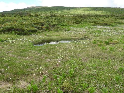 この日、お花畑で目についた花は、チングルマ、イワカガミ、そしてワタスゲです。一番目立っていたのはこのワタスゲでしょう。數も多いし比較的背も高く、何よりも目立つ形狀をしています。それが花言葉通りに風に揺れて色こそ派手さはありませんが、ずいぶん目立っていました。この日は平日でしたが、外出自粛も解除されてましたから予想以上の観光客が訪れており、お花畑內の木道はけっこう混み合っていました。