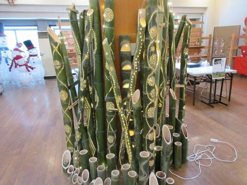 お好きな絵柄に竹に貼り付けて、穴を開けて明かりを燈しています。