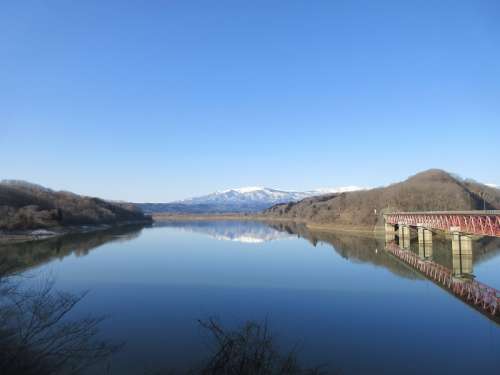 快晴の日、いつも車で通る釜房湖に立ち寄ると、湖面に蔵王連峰が映り「逆さ富士」ならぬ「逆さ蔵王」を見る事ができましたのでお屆けします