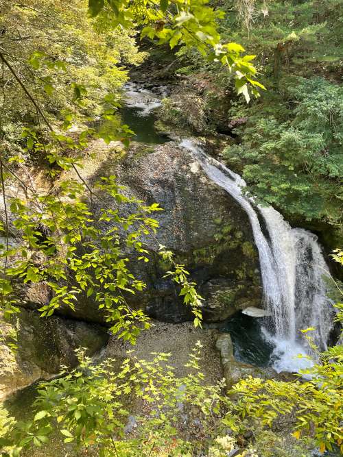 上から滝つぼを除くと紅葉はまだでした。上から見下ろす滝も圧巻です。