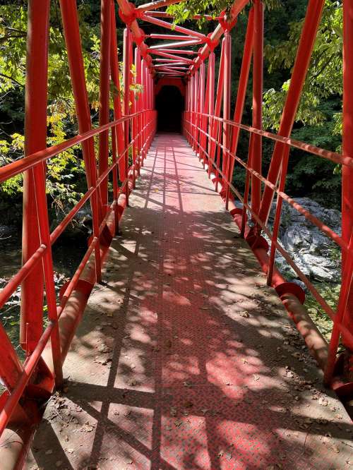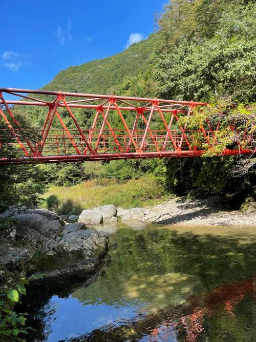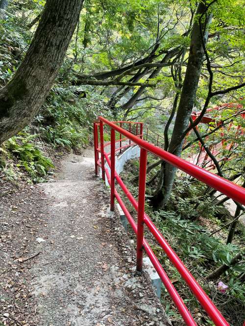樹木の間をくぐり抜けて赤い橋を渡り滝つぼへ。