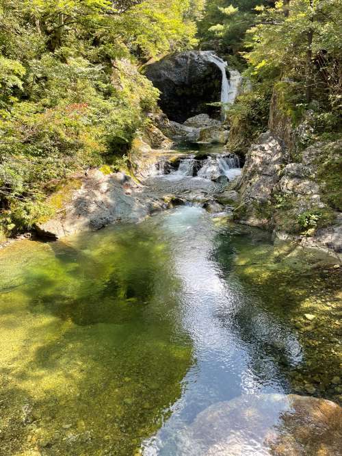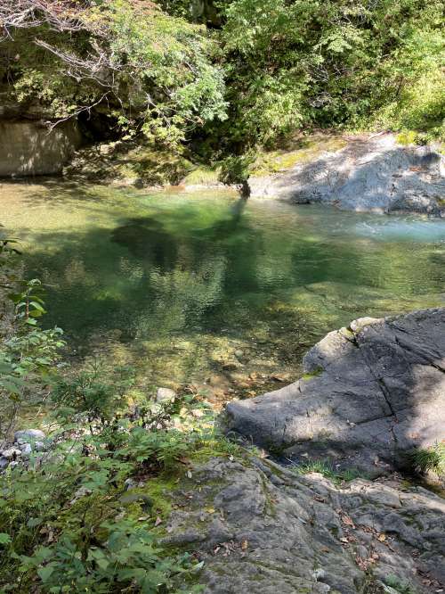 水量が少ない感じですが、滝つぼはエメラルドグリーンでした。