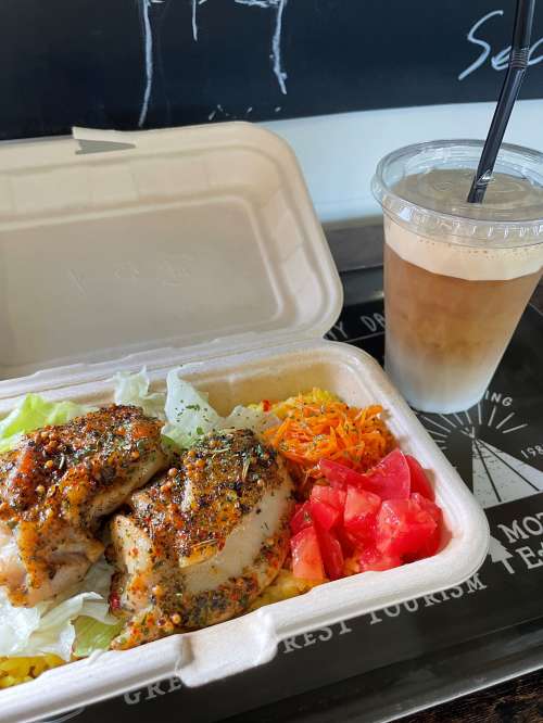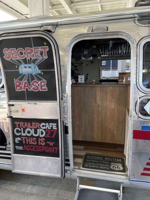 ガソリンスタンド跡地を活用したベース基地「北町ベース」では「トレーラーカフェCLOUD27」內やテラス席で飲食ができます。