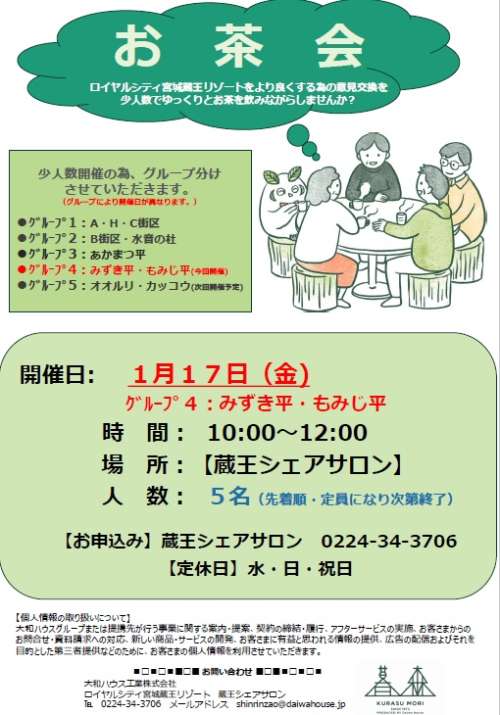 皆様こんにちは 2025年1月のお茶會のご案內です。 今回はグループ4:みずき平?もみじ平のオーナー様です。 ご參加をお待ちしております。