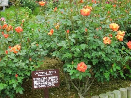 私が気に入ったのは「プリンセスミチコ」という品種、皇太子妃時代の美智子妃殿下に捧げられたバラだそうで、オレンジ色の鮮やかで大きな花に上品な落ち著きを感じました。
