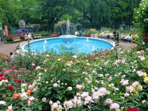 數日前から東北地方も入梅したとの事で、この日も蒸し暑い日でしたが、噴水とバラが涼しさを演出し暑さを忘れさせてくれます。