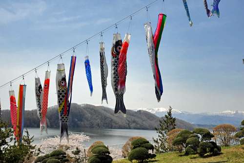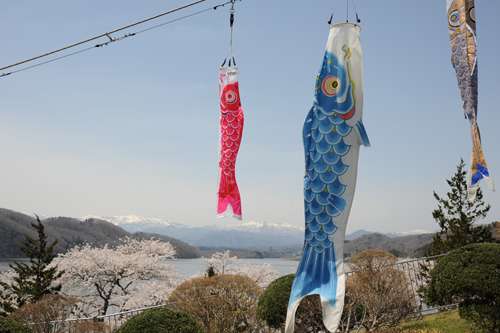 取材した4月23日は釜房湖は満開となり鯉のぼりとの