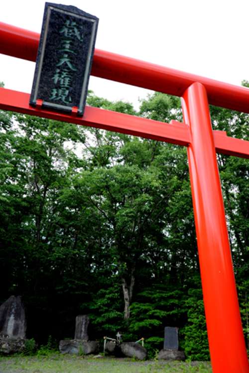 宮城蔵王ロイヤルホテルからエコーラインへ 大鳥居を過ぎた右側に見える鳥居の奧にそれはあります