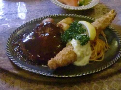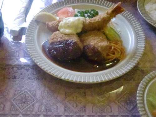少し待っていると來ましたです、ハンバーグと大海老のフライです