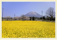 そんな黃色い絨毯の向こうに桜の木と、大山の悠々しき姿が見えています。黃色のインパクトが素晴らしく、菜の花の香りがあたり一面に広がっています。