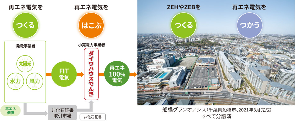 當(dāng)社グループの最大の特長は戸建住宅からマンション、商業(yè)施設(shè)まで幅広い用途建物で、複合的なまちづくりを擔(dān)える點(diǎn)です。そこに「再エネ発電事業(yè)」を組み合わせ、「船橋グランオアシス」では日本初の「再生可能エネルギー100%のまちづくり」※を?qū)g現(xiàn)しました。今後も獨(dú)自性の高い「持続可能なまちづくり」を展開していきます。