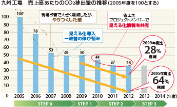 - ※ 省エネ大賞の応募資料に合わせた表記を記載しています(2013年度、工場全體で売上高あたりCO2排出量は2005年度比48%削減、九州工場で同62%削減)。