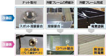 新開発した「かしめ工法」「リベット工法」での接合に切り替え、電著塗裝?乾燥工程を不要にしました。