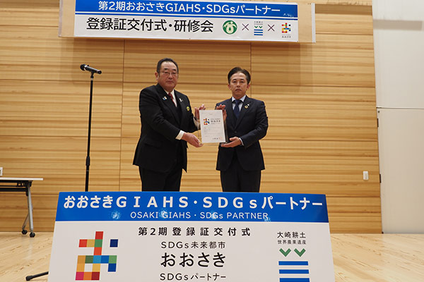 東北工場が長年、労を惜しまず活動を続け、歩んできた道の先に、新しい景色が広がり始めています。2025年、東北工場は大崎市の「おおさきGIAHS?SDGsパートナー」に登録されました。「具體的な行動」が要件とされ、登録までのハードルが高いだけに、地域共生推進委員の佐藤は「私たちのやってきたことが認められ、誇らしかった」と喜びます。