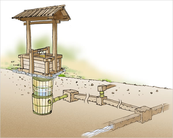 暗渠(水道管の地下埋設)システム。松や檜など、硬くて腐りにくい木の板が選ばれている。
