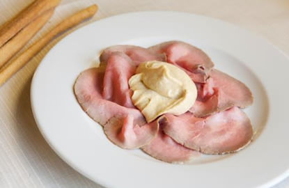 スローフード協會の理念に乗っ取った素材のメニューには、スローフードマークがついています。ピエモンテ州の代表的な郷土料理、子牛のツナソース(Vitello Tonnato)は生産者と提攜し、農家や生産地がサステナブルなビジネスモデルとなるよう配慮されています。