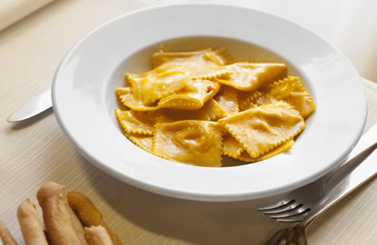 かぼちゃとチーズカステルマーニョのラビオリ(ベジタリアン向けのメニュー)。カステルマーニョはイタリアのD.O.P.(原産地保護名稱)に認定されているチーズ。