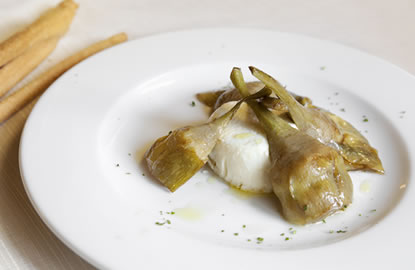 グリルしたアーティチョークとブラテネロチーズのタルトラ(Carciofi scottati con tartrà di Bra tenero)。タルトラはプリンのような食感。スローフードマークはないがピエモンテの郷土料理だ。