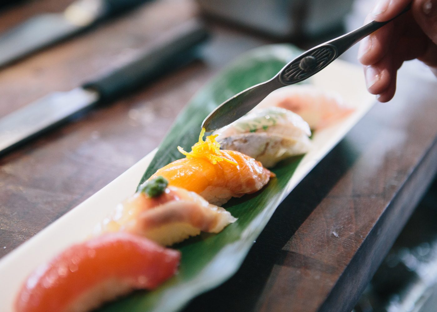 握りも、みかんジャムとガーリックソルトがマスにのせられていたり、赤味噌とバジルのペーストがバスにのせられていたりなど、口に含んだときの旨みの楽しみ方が広がるような、こだわりの工夫が施されています。ちなみにポートランダーがサステナブル壽司にあわせて好んで飲むドリンク類は、にごり酒などの甘めのものが多いそうです。