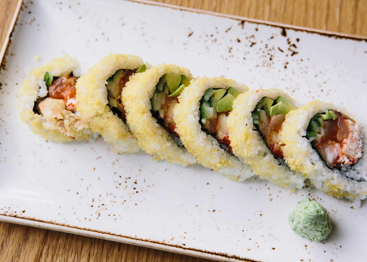 海老の天ぷら、スパイシーな味付けのマグロなどを包んだ裏巻きを、天かすでくるんだメニュー「Chasing the Dragon」。添えられたワサビは、地元オレゴン産。