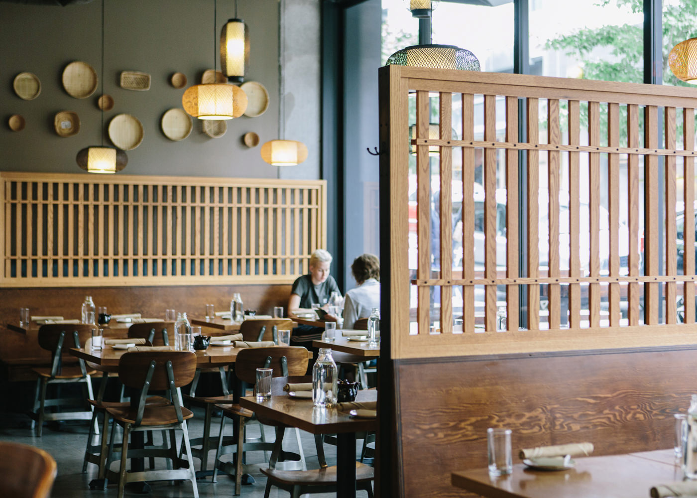 仕切りは格子、壁面にはザルが飾られる店內(nèi)。