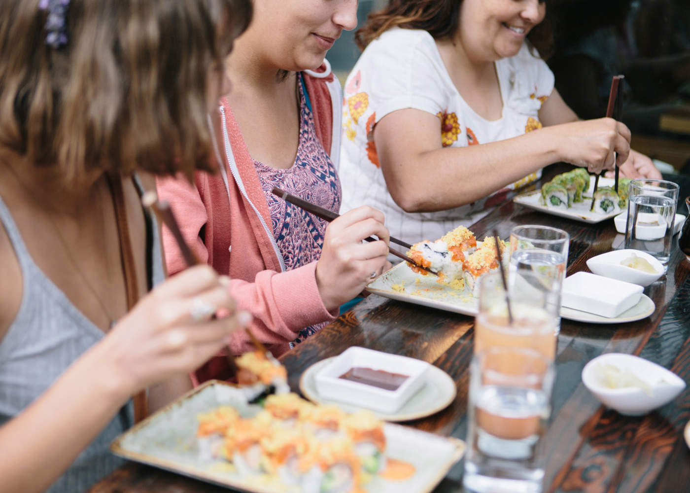 テラス席でサステナブル壽司のランチを楽しむ女性たち。