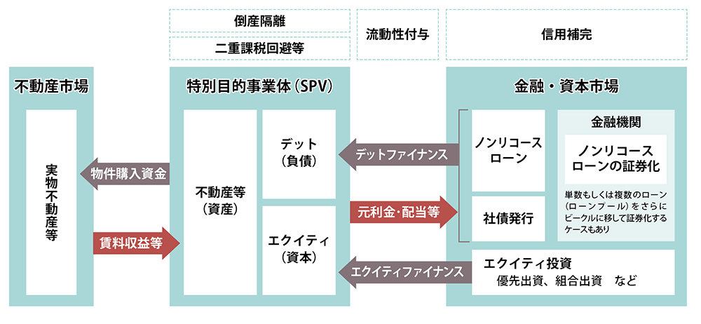 投資家はSPVが発行した証券(不動産証券化商品)を購入し、SPVはそこで得た資金をもとに、借入れの元利払い、投資家への配當などを行います。