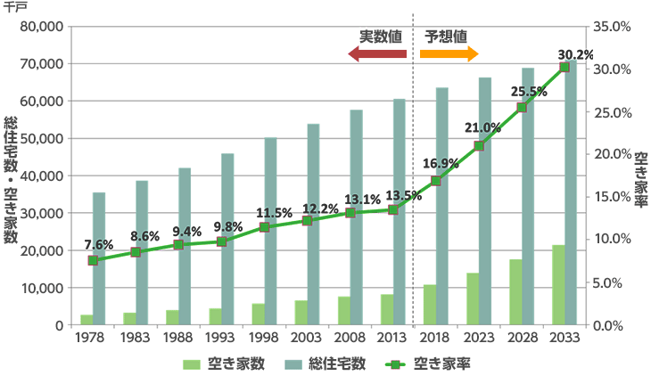 (実數(shù)値:総務(wù)省「平成25年 住宅?土地統(tǒng)計(jì)調(diào)査」予測(cè)値:野村総合研究所公表データより作成)
