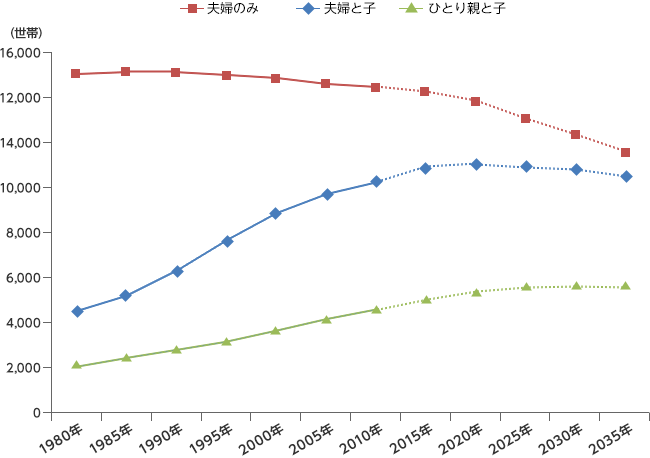 これを見ると増えるのは、ひとり親と子の世帯、そして夫婦のみの世帯です。そして、この図にはありませんが、単獨(dú)世帯も増えます。