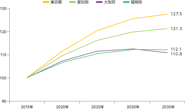 愛知県は21.3%、大阪府、福岡県ともに10%以上の増加予想となっています。大阪府だけが2030年以降に減少するのは、大阪府は4大都市の中で最も早く人口?世帯等の減少が始まるためです。それ以外は、右肩上がりの様相です。