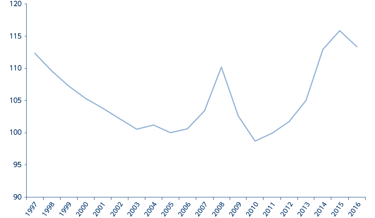 2011年から2015年までの5年間、集合住宅の建築費(fèi)は上昇を続けます。2011年の指數(shù)が98で2015年の指數(shù)が115ですので+17ポイント上昇しています(実際の建築価格ではなく、あくまで指數(shù)です。)