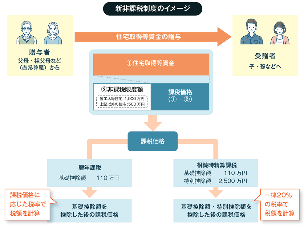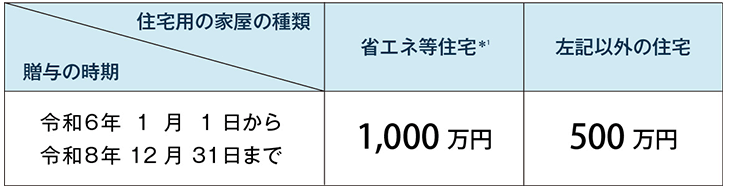 令和6年1月1日から令和8年12月31日までの間に父母や祖父母など直系尊屬から住宅用の家屋の新築、取得又は増改築等のための金銭の贈與を受けた場合において、一定の要件を満たすときは、贈與を受けた方ごとに500萬円(省エネ等住宅※1の場合は1000萬円)まで贈與稅が非課稅となります。