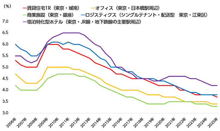図2は、2006年以降の東京主要地區(qū)におけるプロパティ別のキャップレートの推移を示しています(全體的な動向を見るために、すべて揃っている東京のデータを例示)。これをみれば、リーマンショック後にキャップレートは大きく上昇した後、2013年以降は、宿泊特化型ホテルのコロナ禍期間を除けば、概ね右肩下がりが続いています。