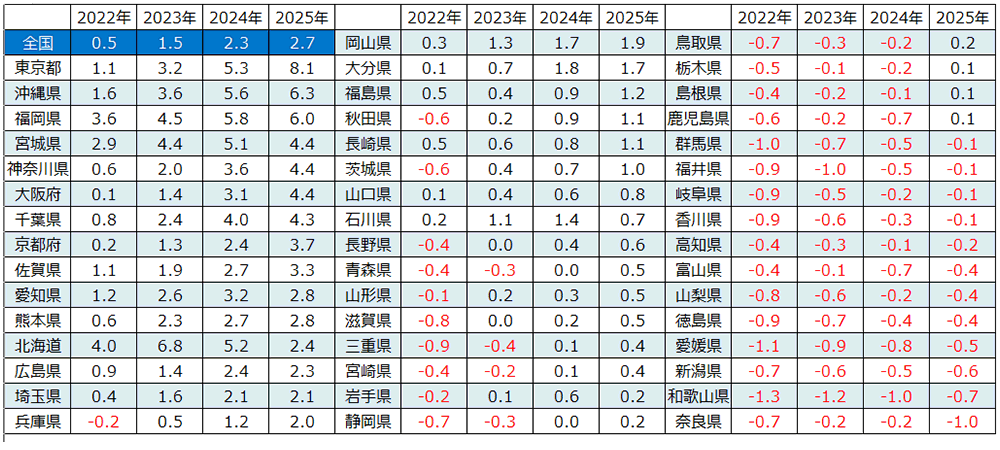 表をみれば、上昇率がトップだったのは東京都で8.1%(前年は5.3%)、次が沖縄県で6.3%(前年は5.6%)、つづいて福岡県で6.0%(前年は58%)となっています。それまで高い伸びだった北海道は前年の+5.2%から+2.4%と上昇幅が縮まりました。同様に、宮城県も+5.1%から+4.4%となっています。約10年近く高い伸びを示していたこれらの地域では、上昇幅に一服感が出てきたようです。