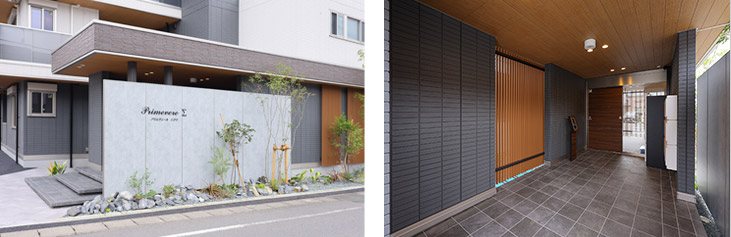 交通量の多い道路沿いということもあり、館名が際立つ高めの外構壁と石や植栽をアレンジして、通りからも存在感のある建物となっています。高級感あるエントランスは、風遠しも良さそうなルーバーが外光をやさしく包み、帰宅した安心感を與えてくれます。